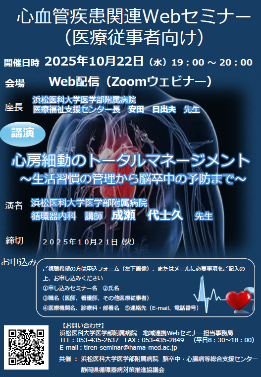 このたび、本事業の一環として、下記のとおり心血管疾患関連Web セミナー(医療従事者向け)が開催されることとなりました。